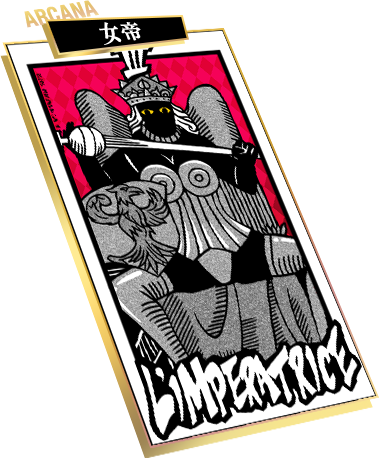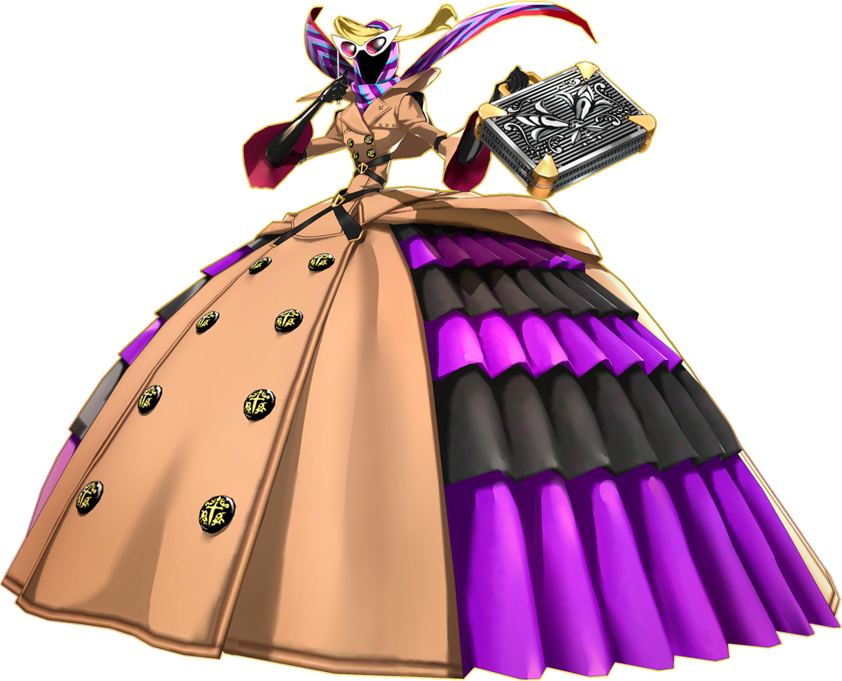 奥村春の初期ペルソナ、「ミラディ」。百合の刺繍に飾られた美しいドレスをまとう貴婦人のペルソナ。しかし優雅なスカートの下には、強力な武器が隠されている。三銃士に登場する女傑と同じ名を持つ。